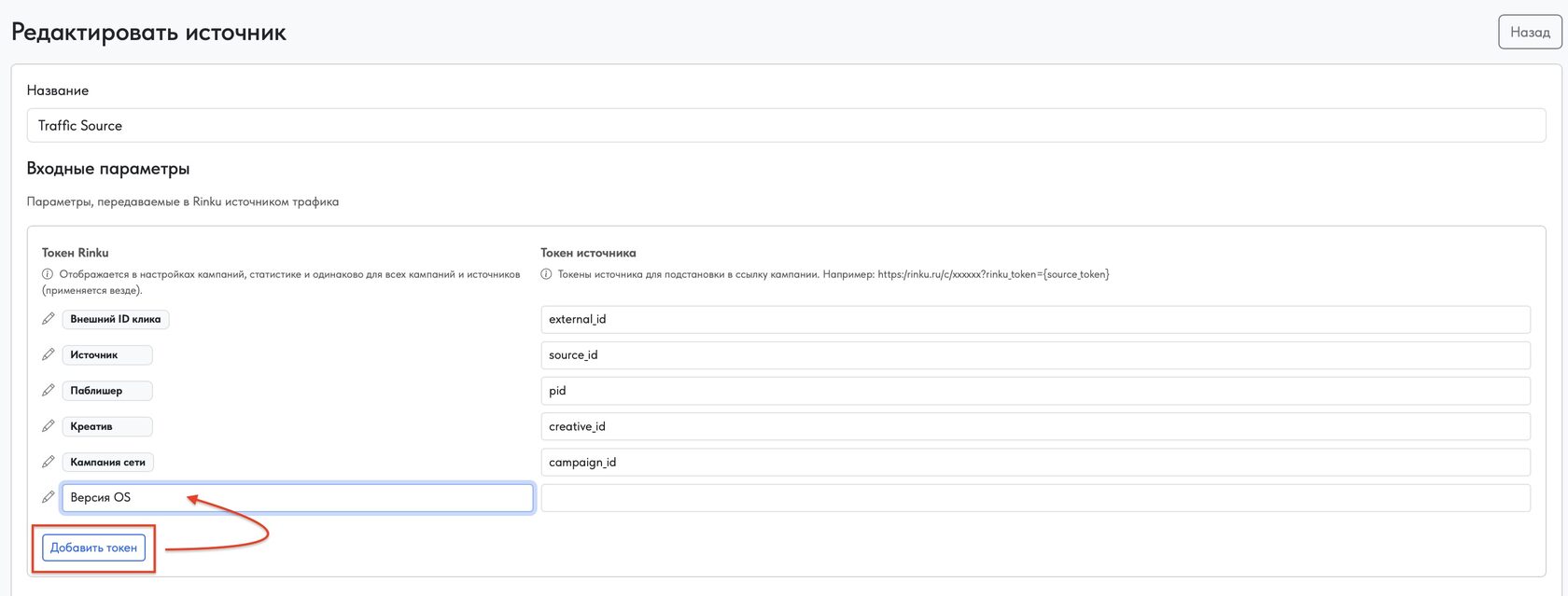 В секции «Входные параметры» для источника вы видите плейсхолдеры, которые источник может подставлять в трекинговые ссылки. Это те параметры, которые источник будет передавать в Rinku при клике.