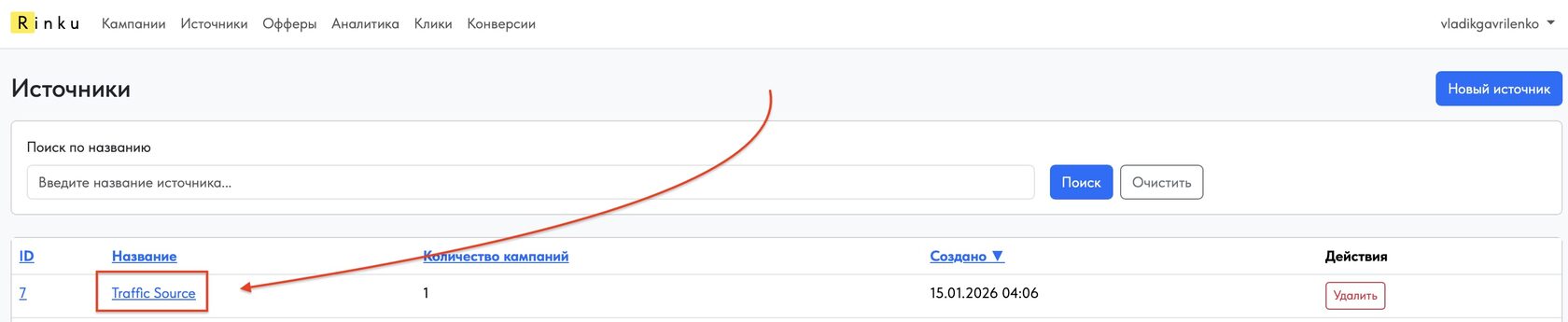 - Название — читаемое имя источника (например: Traffic Source, AdNetwork X).